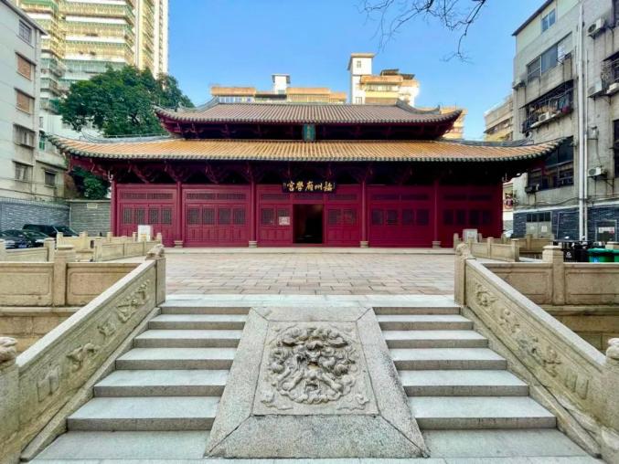 韶州府学宫与风采楼相邻,这里也被称为韶州孔庙。始建于北宋景德三年(1006年),在历经火灾、城市改建后,仅有主体建筑大成殿保存下来,作为韶关市区内仅存的一座明代建筑,被列为广东省文物保护单位。在大革命时期,北江农军在参加南昌起义前夕,曾在韶州府学宫举行誓师并住宿。历经千年风雨的韶州府学宫,见证了科举考试制度和红色革命岁月,饱含韶关人的汗水与斗志。