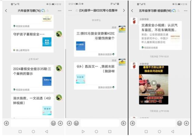 做好防溺水安全温馨提示。各学校班主任老师们每天利用班级微信群坚持对学生及家长进行防溺水安全提醒,每周通过防溺水宣传视频强化预防学生溺水安全教育,让家长及学生时时刻刻把“预防溺水”安全知识牢记心间。同时,班主任老师们及时将涉及防溺水知识的公众号、县教育局推送的防溺水宣传短视频和防溺水简报转发到班级群,时刻唤起家长及学生的防溺水的警惕性。重点对留守儿童、离异家庭儿童、问题学生等重点群体,随时进行电话提醒,并提醒家长落实教育监管责任。