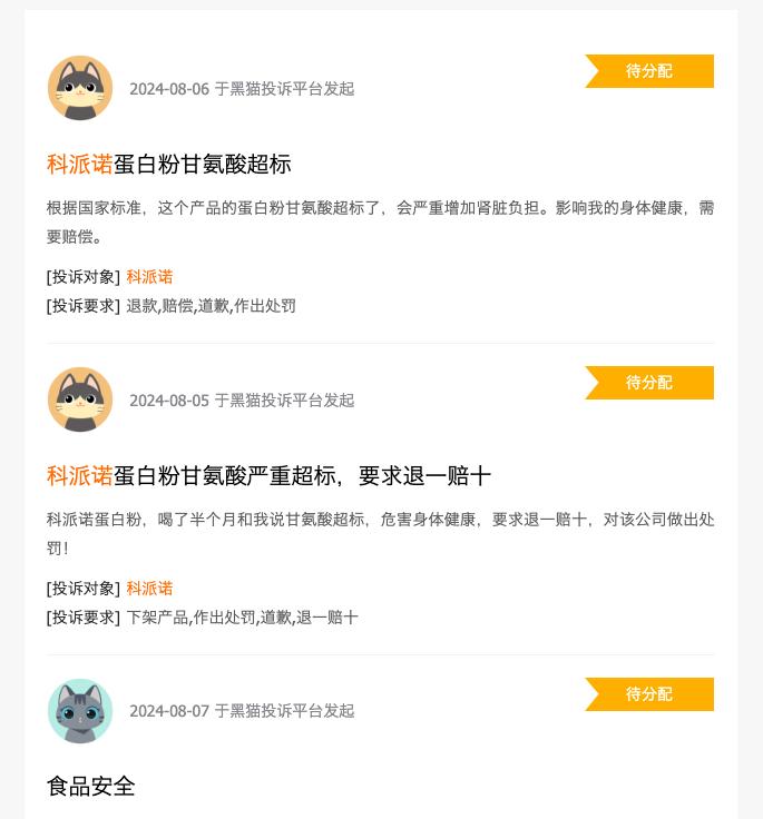近日,运动营养品牌科派诺的蛋白粉被曝出食品安全问题,大量消费者在黑猫投诉平台曝光称,在科派诺运动营养旗舰店购买的189元蛋白粉中甘氨酸含量异常超标,每100克中添加量高达10克,远超正常标准。过量摄入甘氨酸可能增加肾脏负担,影响必需氨基酸生成,导致营养失衡,危害消费者健康。蓝鲸新闻记者对相关事件进行了深入调查。