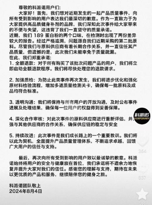 由于代销的蛋白粉存在产品质量问题,一时间贾博钧遭到圈内人士的讨伐,众多购买了该产品的消费者纷纷发起退款。8月4日,科派诺发文致歉称:“蛋白粉检测出现问题原因在于采购的原料,尽管与原料供应商存在长期合作问题,但未能幸免于质量疏漏,公司将对购买该批次产品的用户全额退款。”随后,贾博钧也对此事进行了公开致歉。目前,双方的致歉信均已被删除。