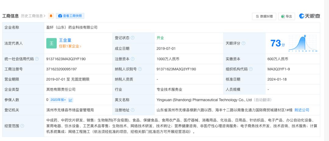蓝鲸新闻记者通过科派诺的官方店铺查询发现,其关联公司为盈轩(山东)药业科技有限公司,该公司成立于2019年7月,成立至今仅5年时间,法定代表人为王金童,注册资本1000万。