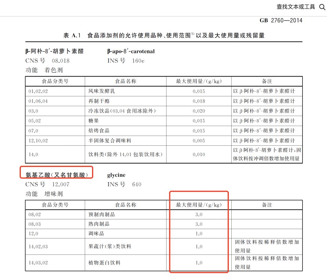 根据《中华人民共和国国家标准食品添加剂使用标准》(GB2670-2014),甘氨酸最大使用量为3克/千克,且使用范围为预制肉制品等,而科派诺蛋白粉甘氨酸含量为10克/100克,该含量远超过甘氨酸允许使用的最大使用量3克/千克。