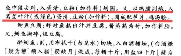 《调鼎集》鲥鱼圆:脸绿鸡圆(凡攒团宜加肉膘及酒膏易发而松)鲥鱼中段去刺,入蛋清、豆粉(加作料)㓠圆。又,以鸡脯㓠绒,入莴苣叶汁(或绿色)蛋清,豆粉(加作料),圆成配笋片、鸡汤脍。