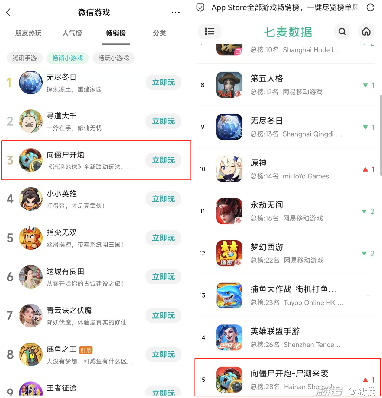 从市场数据来看,《向僵尸开炮》小游戏基本稳坐微信小游戏畅销榜TOP3,在App端同样保持强劲的市场竞争力,长期稳定在游戏畅销榜前20,仅次于《原神》《梦幻西游手游》《英雄联盟手游》等王牌产品。