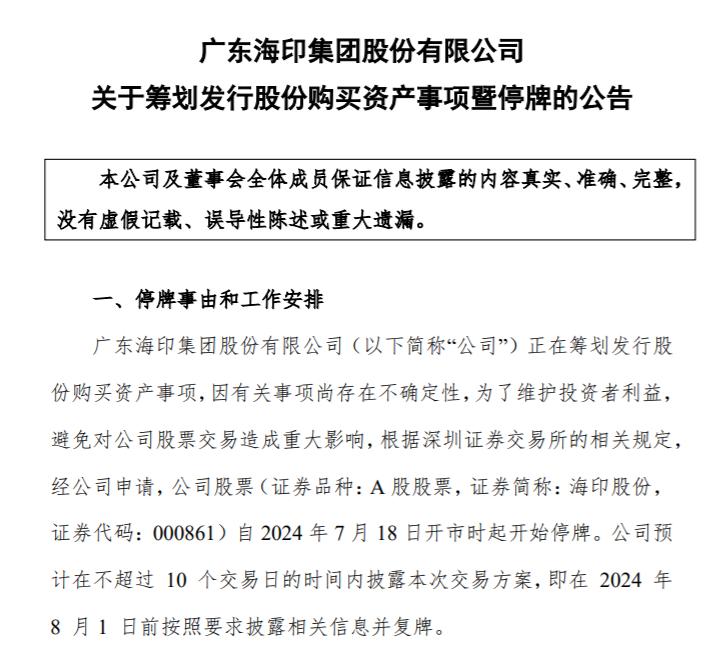 7月10日,海印股份曾发布公告称,公司全资子公司广州海印国际商品展贸城土地收储等,政府核定的各项投入、补偿等合计金额共18.25亿元,这被视作公司的重大利好。7月17日,海印股份发布停牌公告,称公司正在筹划发行股份购买资产事项,有关事项尚存在不确定性,因此公司股票自7月18日开市起停牌。