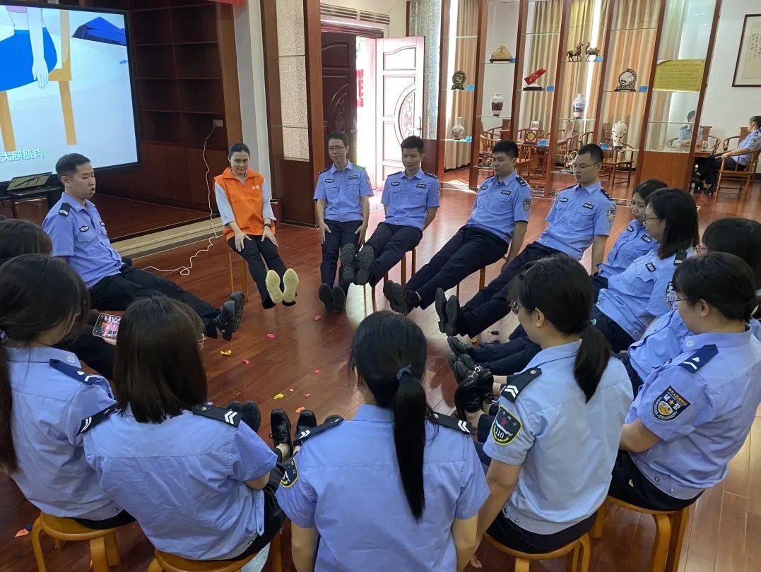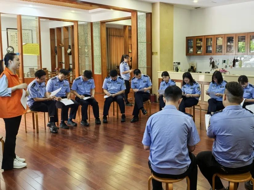 小组活动在有趣的互动、愉悦的氛围中进行, 共分为“我的减压花园”“ 社会支持网络谈生活与工作”“携手共进退”“我的未来不是梦”等4个章节。社工带领大家开展名字接龙、“大风吹”、支持网络图、盲人和聋子、情感病毒等小游戏和分享自身压力、学习渐进式肌肉放松技术、合唱《中国人民警察警歌》等活动,并邀请阳江市演讲协会创会会长李湘粤分享沟通技巧,从语音、语调、对话技巧等角度对接警员进行语言艺术指导。