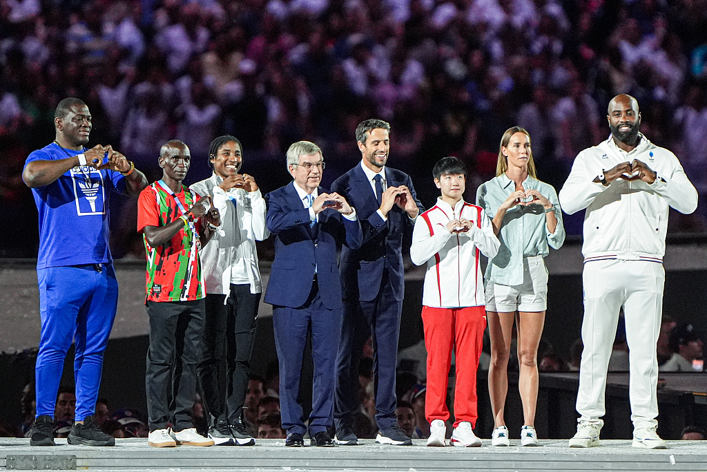巴黎奥运会闭幕式上,中国女子乒乓球运动员孙颖莎作为亚洲的运动员代表登台。在本届奥运会上,孙颖莎共获得2金1银三枚奖牌。(澎湃新闻记者 陈均)