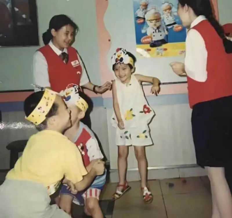 90年代参加表哥的肯德基生日会,照片里我被“踩气球”游戏吓得不敢动,尴尬而不失礼貌的微笑着。