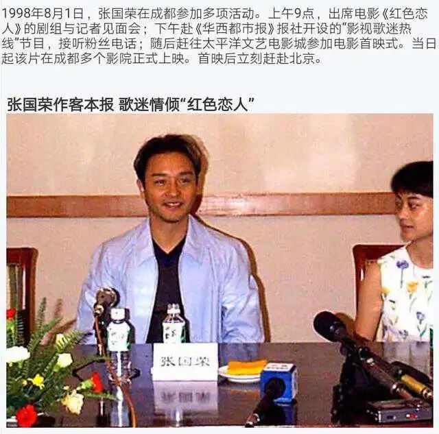 98年,张国荣来成都和影迷见面,为电影《红色恋人》做宣传(图片来源网络)
