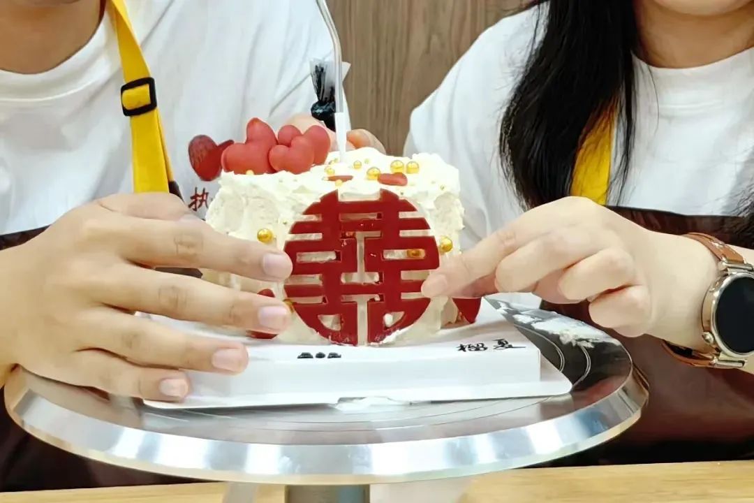 仪式结束后,新人们前往烘焙教室,亲手制作象征甜蜜爱情的蛋糕。
