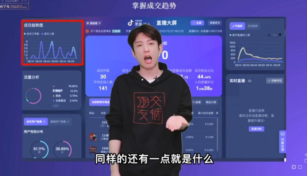 简单举个例子,像左上角的成交趋势图,能判断不同时间直播间的成交单量情况,反应你的成交密度和效率。