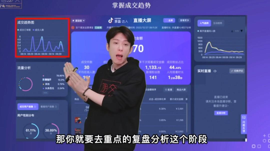 讲的挺细致的,比如老师分析了整张抖音后台大屏,从左上角的成交趋势图,一直到右边的人气趋势等等,每个模块他都讲到了。从左到右,从上到下,全摸了个遍。