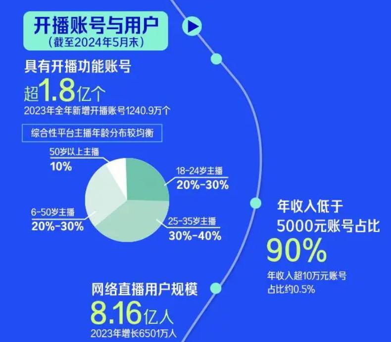 其中, 90% 的主播年收入低于 5000 元,年收入超过 10 万元的账号占比只有 0.5% 。