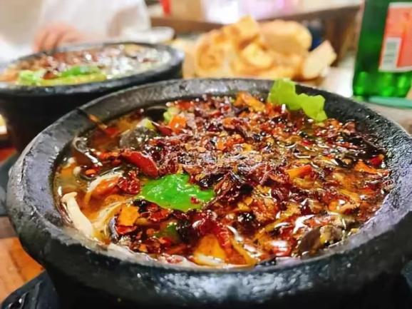 焦作市武陟县,是“黄河文化之乡”。因黄河文化而成就的武陟砂锅最为著名。武陟砂锅,传承千年。制作时,先将肉类食材热锅清水断生、去异味,然后放入盛有清水的砂锅内,旺火烧开,再用小火慢慢煨煮,汤味浓厚,肉质酥嫩香烂。最令人惊艳的是,武陟砂锅端上餐桌后,服务员会端着一勺刚炸好的红辣椒油倒入砂锅,“刺啦”一声,刺激食客们的味蕾。