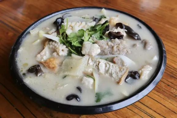 杂拌,也叫烩菜。焦作的博爱杂拌其主要原料有皮肚、油炸豆腐、腐竹、水氽丸等10余种食材,与肉汤炖在一起烹饪而成。在一碗地道的博爱杂拌里,竹笋与玉兰片永远不会缺席,它们的清香平和了五花肉和丸子的腻,增强了汤的鲜。松花蛋