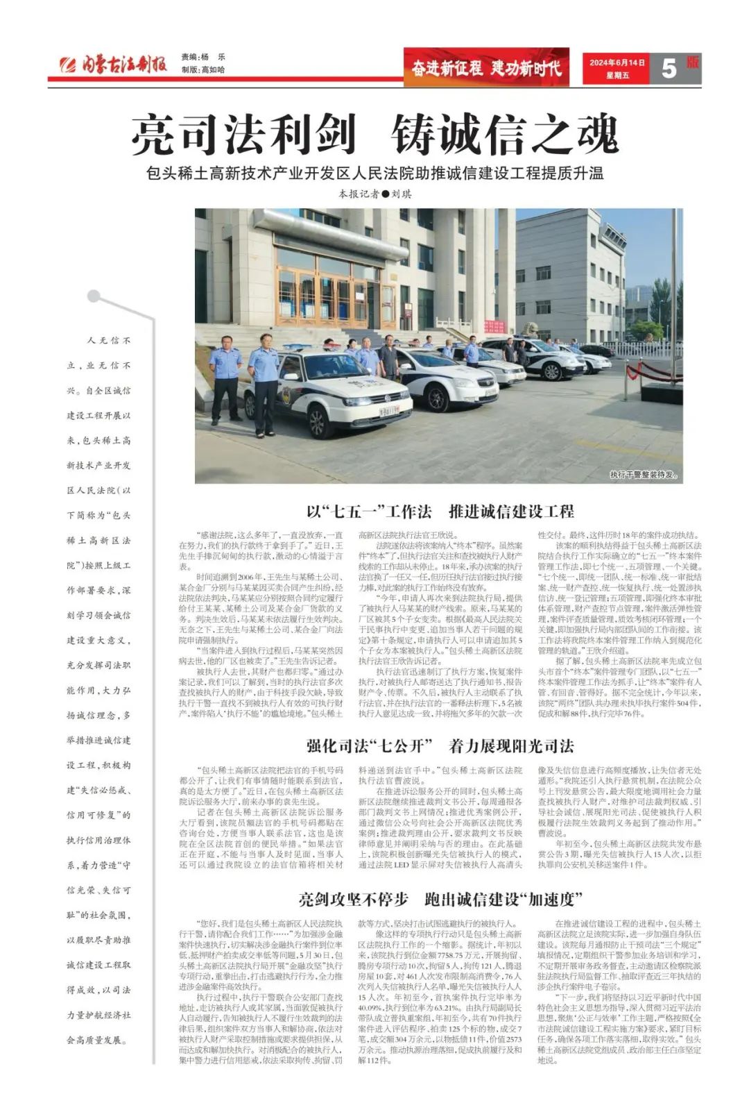 据了解,包头稀土高新区法院率先成立包头市首个“终本”案件管理专门团队,以“七五一”终本案件管理工作法为抓手,让“终本”案件有人管、有回音、管得好。据不完全统计,今年以来,该院“两终”团队共办理未执毕执行案件504件,促成和解88件,执行完毕76件。