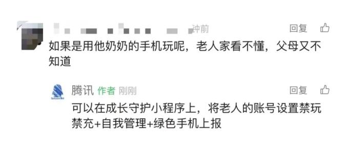 对此,腾讯方面回复称,可以在成长守护小程序上,将老人的账号设置“禁玩禁充+自我管理+绿色手机上报”。