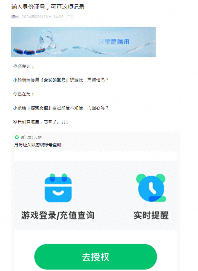 13日午间,腾讯发布身份证关联游戏账号查询新功能,孩子使用家长的账号玩游戏、充值,都可以即时查询。
