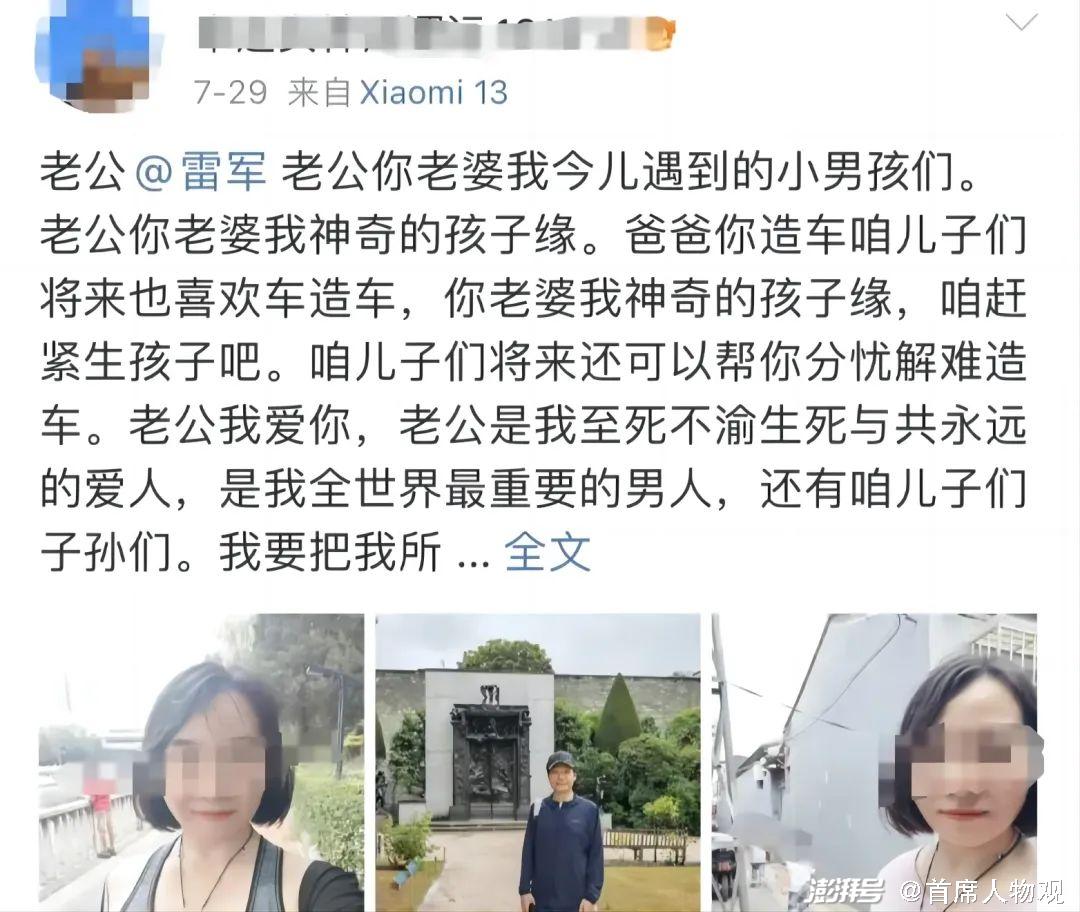 一位女网友频繁发布微博,几乎每天都带上“老公”的称呼并@雷军,并扬言要给他生孩子。在互联网大佬要么因为超级财富而被仰视、要么因为巨额财富而被谩骂的当下,雷军这样的待遇,算是独一份。即使是当年“二马”叱咤江湖时,你也很难见到谁高喊要为他们生孩子。