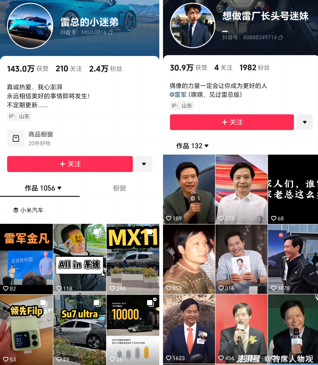 实际上,一些“站哥站姐”已经露出苗头,“雷总的小迷弟”“想做雷厂长头号迷妹”“奔米之家”“关你什么事”……这些博主的账号中,关于雷军和小米占据了绝大部分的内容。继手机圈、家电圈、汽车圈之后,看起来,雷军正式“征战”饭圈了。