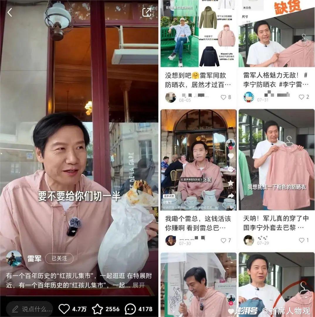 雷军甚至把粉色直接穿上了身。——在征求过网友意见后,他穿了一件粉色防晒衣前往巴黎出差,并在巴黎街头“表演”了优雅进餐。毫无疑问,这又为他的女性粉丝们提供了时髦的讨论素材。