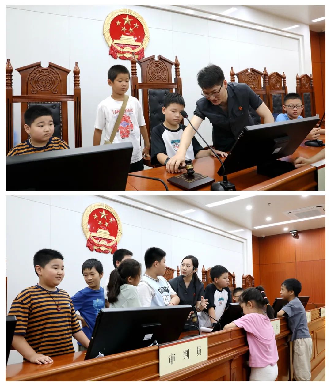 “大家现在所处的位置是诉讼服务中心,这是当事人到法院起诉的第一道窗口。”在青年干警的带领下,孩子们对法院工作、诉讼流程和各种智慧法院设备充满了兴趣。在审判法庭中,青年干警向孩子们介绍了法庭布局、庭审人员构成和审判基本流程,并对法袍、法槌、法徽的含义进行详细讲解,让大家真切体会到审判的庄严与神圣。孩子们热情高涨,纷纷主动要求扮演法官、律师等人物角色。真实的场景和氛围感,让孩子们在寓教于乐中增强法治意识、感受法律权威。