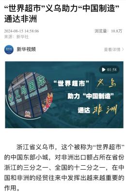 8月15日,新华社客户端推送《“世界超市”义乌助力“中国制造”通达非洲》,关注“世界超市”义乌在中国和非洲的经贸往来中发挥出越来越重要的作用。
