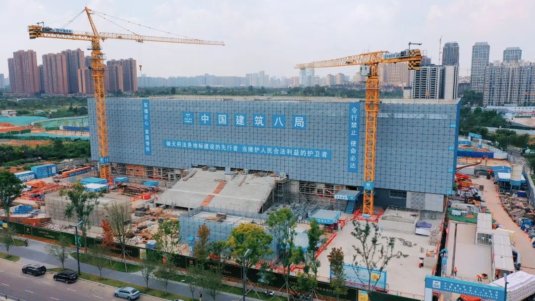 近日,位于天府中央法务区法务岛的四川省高级人民法院天府中央法务区审判法庭项目(以下简称省高院中央法务区审判庭)主体结构全面封顶。