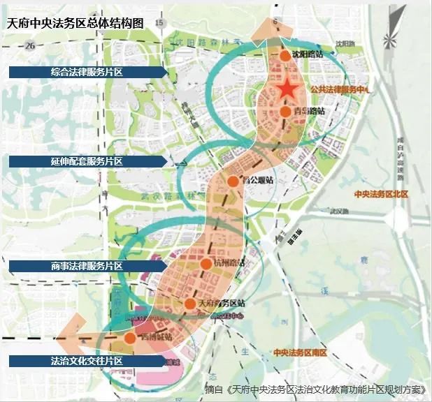 目前,随着天府新区法院(四川自贸区法院)、天府新区(四川自贸区)检察院、天府新区公安分局的陆续入驻。以及四川省高级人民法院天府中央法务区审判法庭、成都市中级人民法院天府中央法务区审判法庭、成都铁路运输第一法院审判法庭(加挂“成都互联网法庭”)、成都铁路运输第二法院审判法庭(加挂“四川大熊猫国家公园生态法庭”)、成都知识产权法庭、成都金融法庭、成都国际商事法庭、成都破产法庭等国家、省市法律审判机构的预约“落户”。这座以司法审判资源高密度集中的“岛群”已初见雏形。