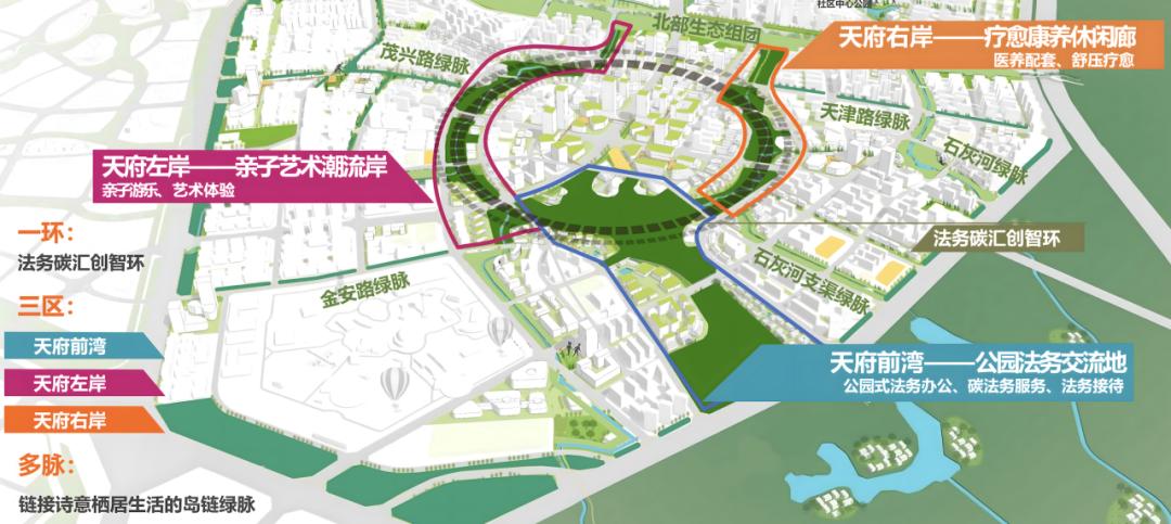法务岛绿廊将借鉴优秀案例,秉承“法务+”的核心理念,以“一环三区多脉”为整体结构(一环即法务碳汇创智环;三区即天府前湾、天府左岸、天府右岸;多脉即链接诗意栖居生活的岛链绿脉),实现生态价值转化,打造一条高品质城市环形绿廊。从功能上看,天府前湾为公园法务交流地,让市民体验公园式法务服务;天府左岸为亲子艺术潮流岸,承接西侧麓湖、香山中学和周边居住人群,提供高品质生活配套产业;天府右岸为疗愈康养休闲廊,围绕天府人民医院和周边人群,打造医养、疗愈主题配套产业。