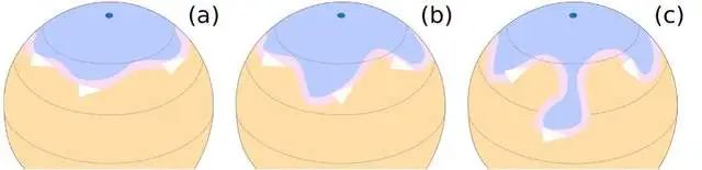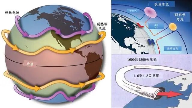 图、罗斯贝波:北半球急流在北极涡流周围蜿蜒发展(a和b),最后分离出冷空气(c),其中橙色为暖气团;粉色为急流;蓝色为冷气团高空急流长约1600~4800千米,厚约1.6~4.8千米,风速超过90千米/小时,最大记录达到398千米/小时。高空急流会剧烈地横向漂移,并在高度上发生变化。高空急流形成的位置位于对流层顶的断裂附近,处于极地环流、费雷尔环流和哈德利环流之间的过渡处。