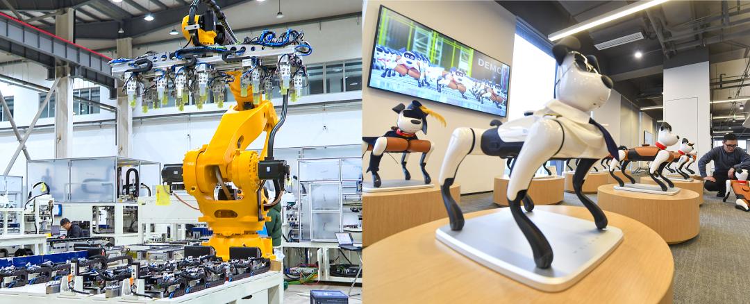 埃斯顿智能科技(江苏)有限公司生产厂区(左)。蔚蓝科技面向消费者推出具有人工智能的四足机器人(右)。南京日报/紫金山新闻记者 冯芃 段仁虎 董家训 孙中元 摄。