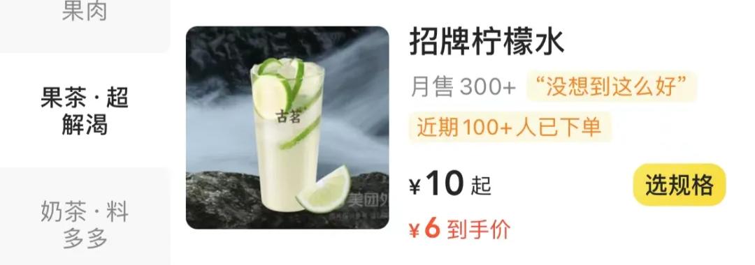 不知不觉间,“10元以下”成了各大新茶饮品牌“厮杀”的重点区间。一直在低价区间深耕的蜜雪冰城,凭借4元柠檬水、2元冰激凌等,带动其他品牌价格降下来了。在外卖平台上查询发现,古茗的招牌柠檬水,到手价仅需6元。茶百道也有不少价格在10元以下的产品。