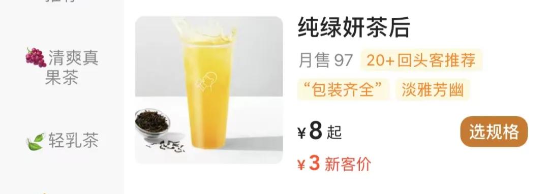 此外,曾经价格不便宜的喜茶,也有10元以下的产品“纯绿茶妍后”。