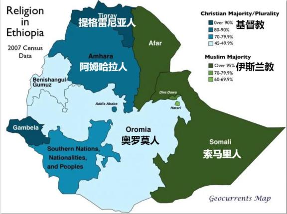 ▲埃塞俄比亚的四大民族和两大宗教分布这四大民族主要分为两大类,奥罗莫人和索马里人属于库希特语族,阿姆哈拉人和提格雷尼亚人属于闪米特语族。