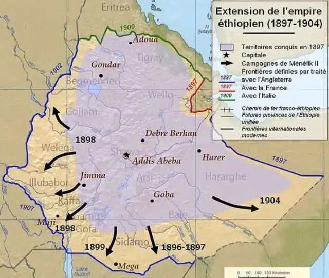 1862年,法国占领埃塞俄比亚与索马里交界处的吉布提港口。英国在1866年入侵埃塞俄比亚,却被高原折腾得筋疲力尽,更因为当地人的激烈反抗而没有征服这片土地。但埃塞俄比亚内部的割据势力给殖民者留下可乘之机。