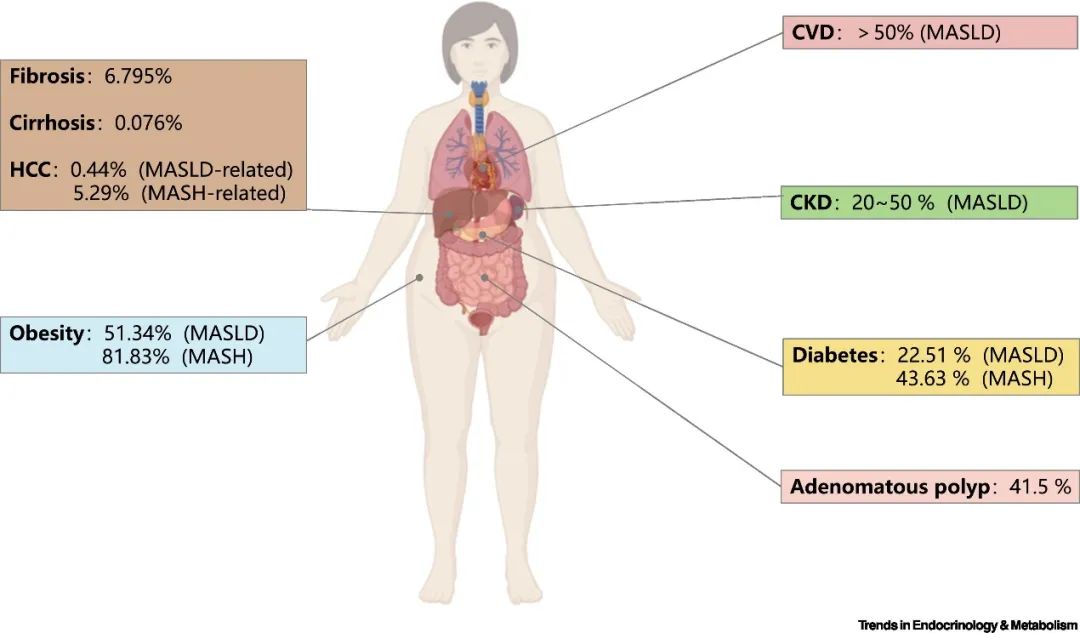 MASLD对健康的影响不仅局限于肝脏,还与心血管疾病、慢性肾脏疾病、肥胖和2型糖尿病等密切相关。全球数据显示,MASLD已成为肝细胞癌(HCC)的主要原因之一,MASLD患者发展为HCC的风险显著增加。MASLD相关HCC的年发生率约为0.44%,而MASH相关HCC的发生率可高达约5.29%。此外,肥胖和2型糖尿病是MASLD发展的主要风险因素, MASLD患者的肥胖率高达近80%,而T2D的患病率可达43.63%。