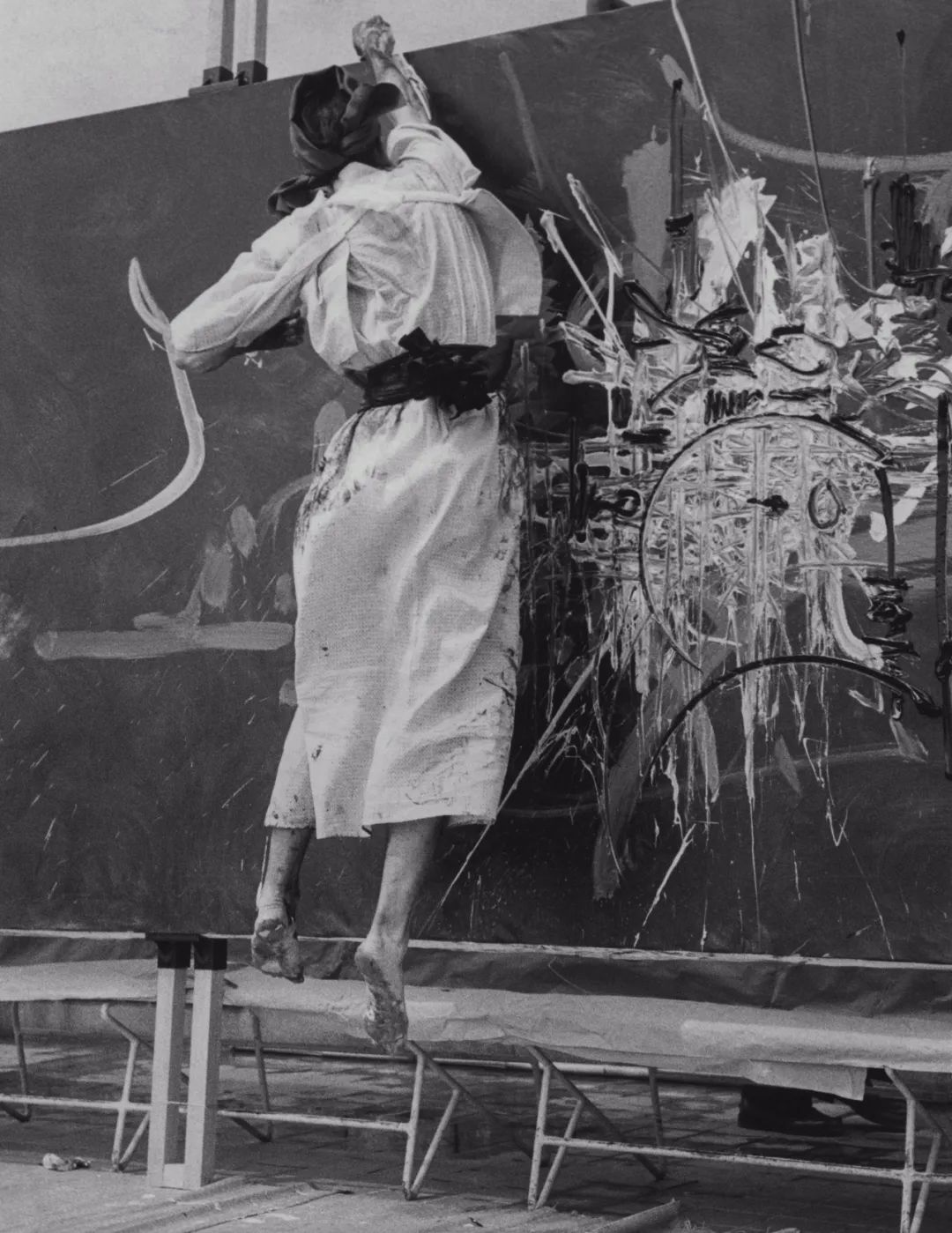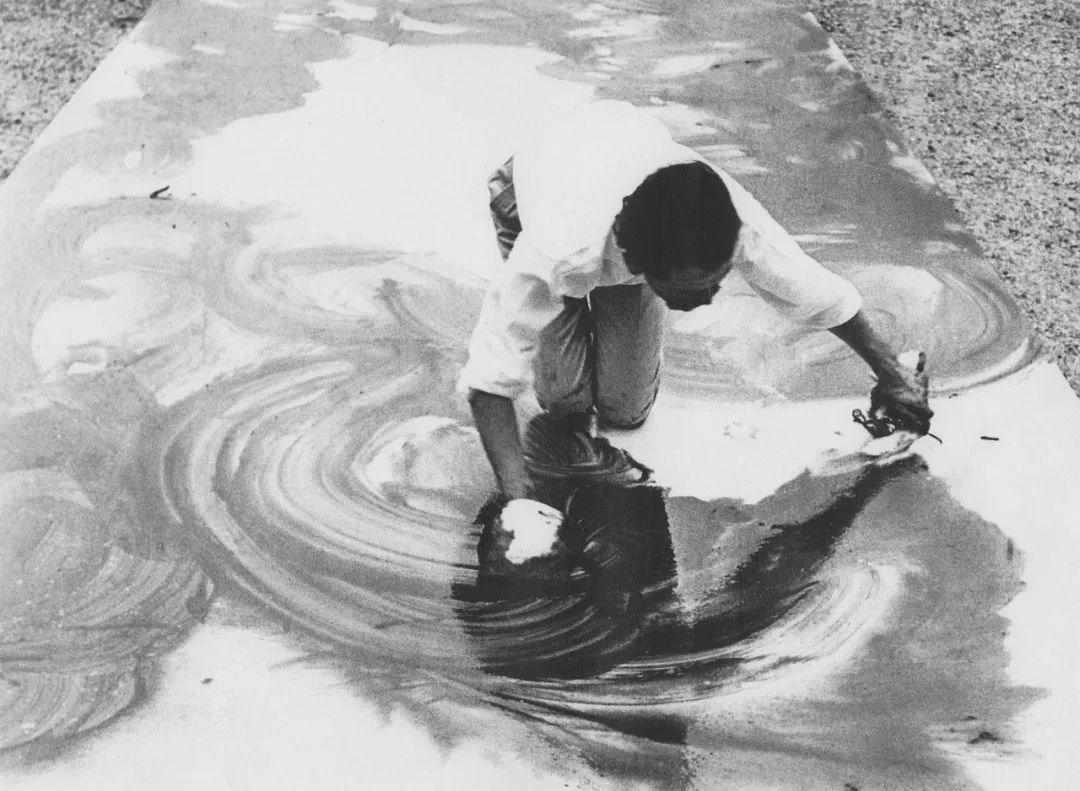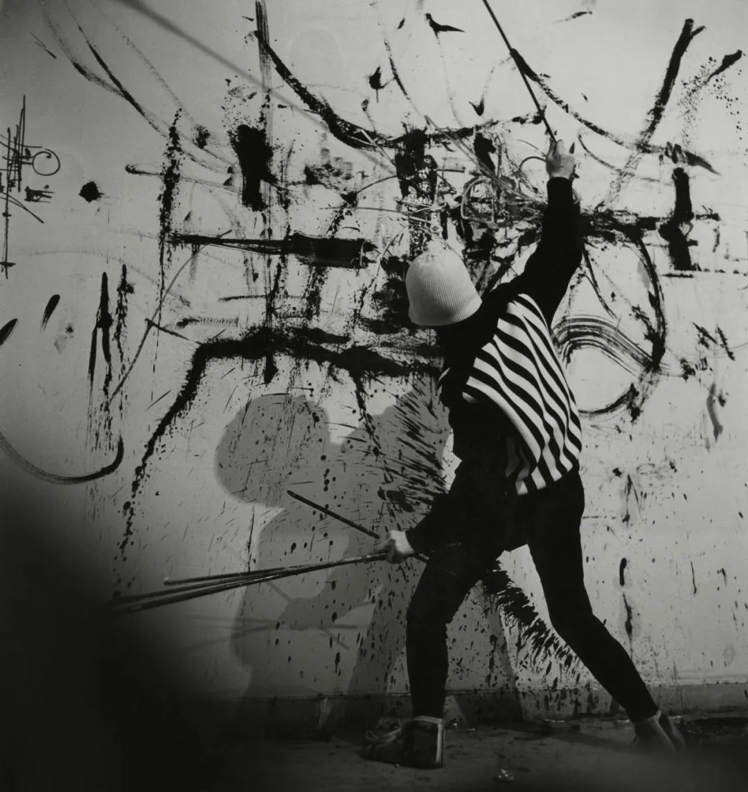 1957年,乔治·马修在日本大阪大丸百货的屋顶上现场创作《向秀吉将军致敬》。©Comité Georges Mathieu / ADAGP, Paris, 2024.零度写作