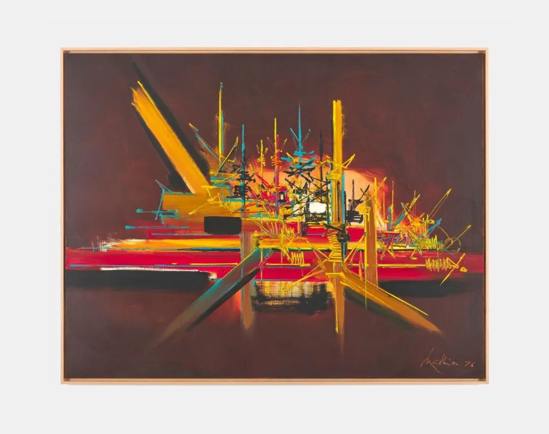 例如,在1980年的作品《神秘的统治》中,破碎的线条浮现于深色背景以及较亮的区域里,创造出迷人又难以捉摸的深度效果。对于马修而言,每一幅作品都是一场庆典,标志着一个纯粹而独特的诞生时刻,如同他最钟爱的作家约瑟夫·康拉德所言:“理想往往只是现实的炽热愿景。”