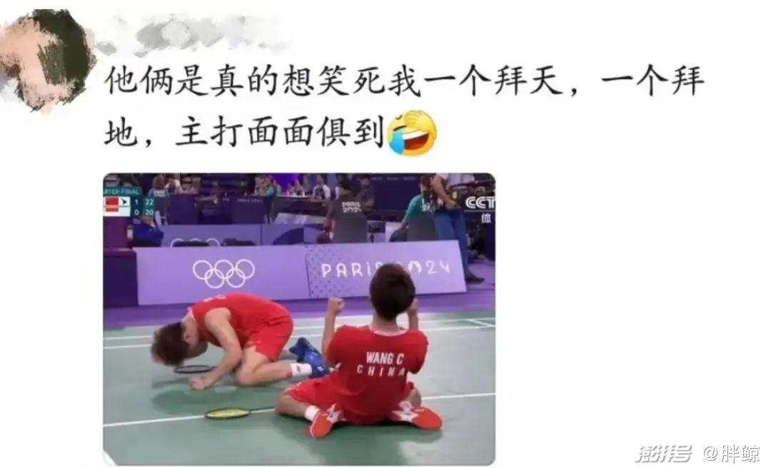还有靠松弛感出圈的“梁王组合”,赛场上激烈夺分,梁王二人却状况不断。一会梁伟铿一个滑步球拍直接脱手,若无其事捡回来时,搭档王昶还趁机得了一分。比赛间隙,两人认真交头讨论,本以为该是规划什么战术,一听却是: