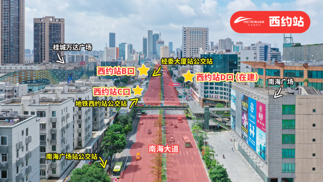 西约站位于南海大道中,其中,桂城万达广场旁设有B、C出入口,正在建设的D出入口位于南海大道北西侧,临近南海新闻中心大楼。