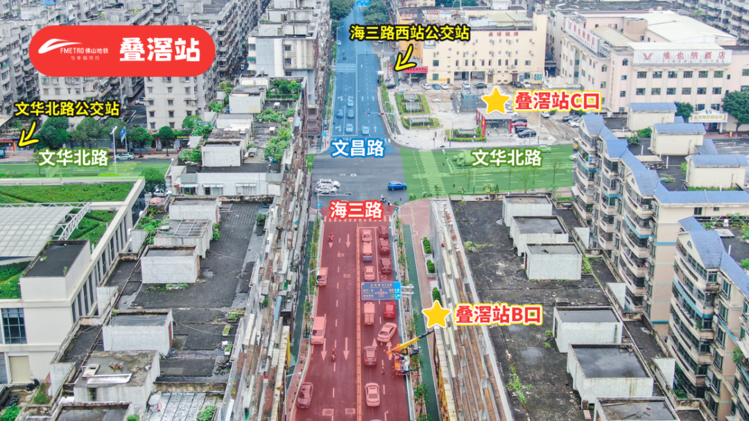 叠滘站地处文华北路和海三路交界,设有两个出入口B、C。
