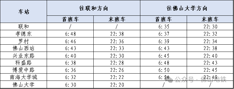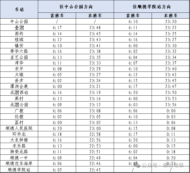 开通当天起,3号线运营服务时间对比当前首通段的运营服务时间会有所调整,其中,“顺德学院站-中山公园站”单程为62分钟,高峰、平峰、低峰行车间隔分别为5分39秒、8分29秒、9分30秒;“联和站-佛山大学站”单程为21分钟,全天行车间隔为9分钟。