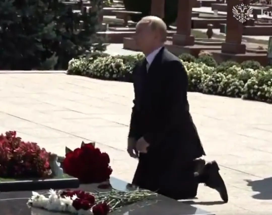 在别斯兰学校体育馆旧址之处的纪念碑前,普京双膝跪地,并向纪念碑献花。