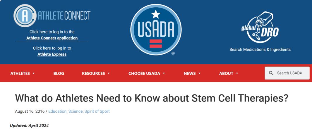 2024年4月,美国反兴奋剂局(United States Anti-Doping Agency, USADA)通过其官方网站更新了一项重要声明,强调了运动员群体了解干细胞疗法相关知识的重要性,并对这一疗法在运动损伤修复领域的积极作用给予肯定。