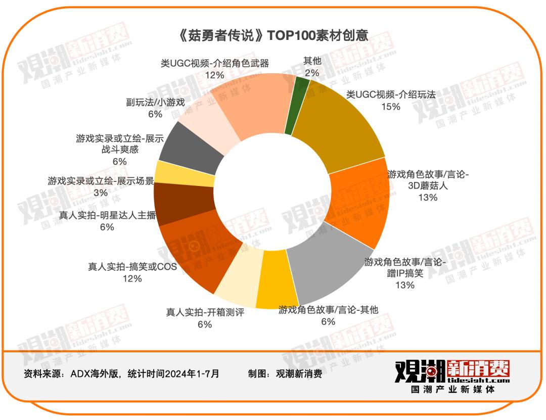 在营销上,《菇勇者传说》的海外视频素材也十分多元,介绍玩法、游戏角色和蹭IP搞笑内容占比较高。