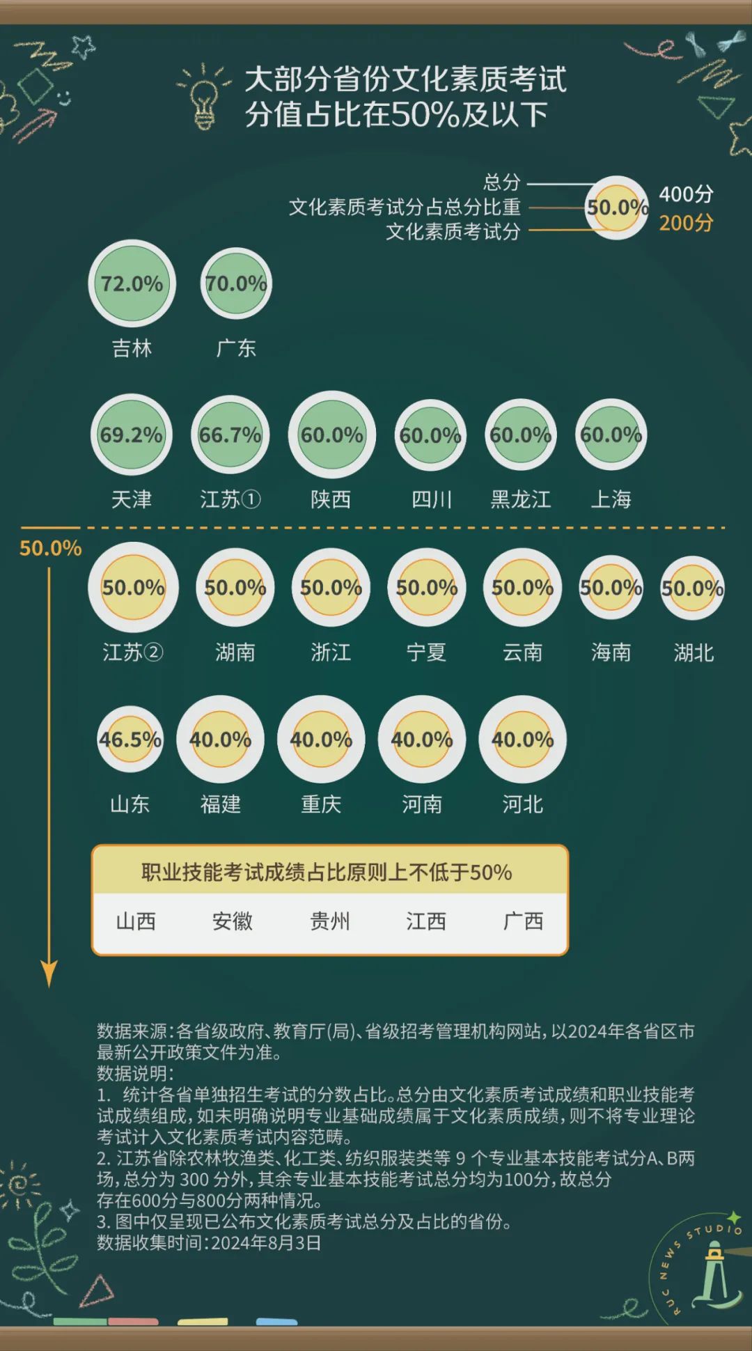 通过公开资料的整理可见,至少有17个省(直辖市、自治区)在职考中,将文化素质设置为总分的50%及以下。除了吉林、广东、天津等少数几个省(直辖市),在对口升学中,对中职学生们的文化素质的考核仅占半壁江山(甚至更低)。