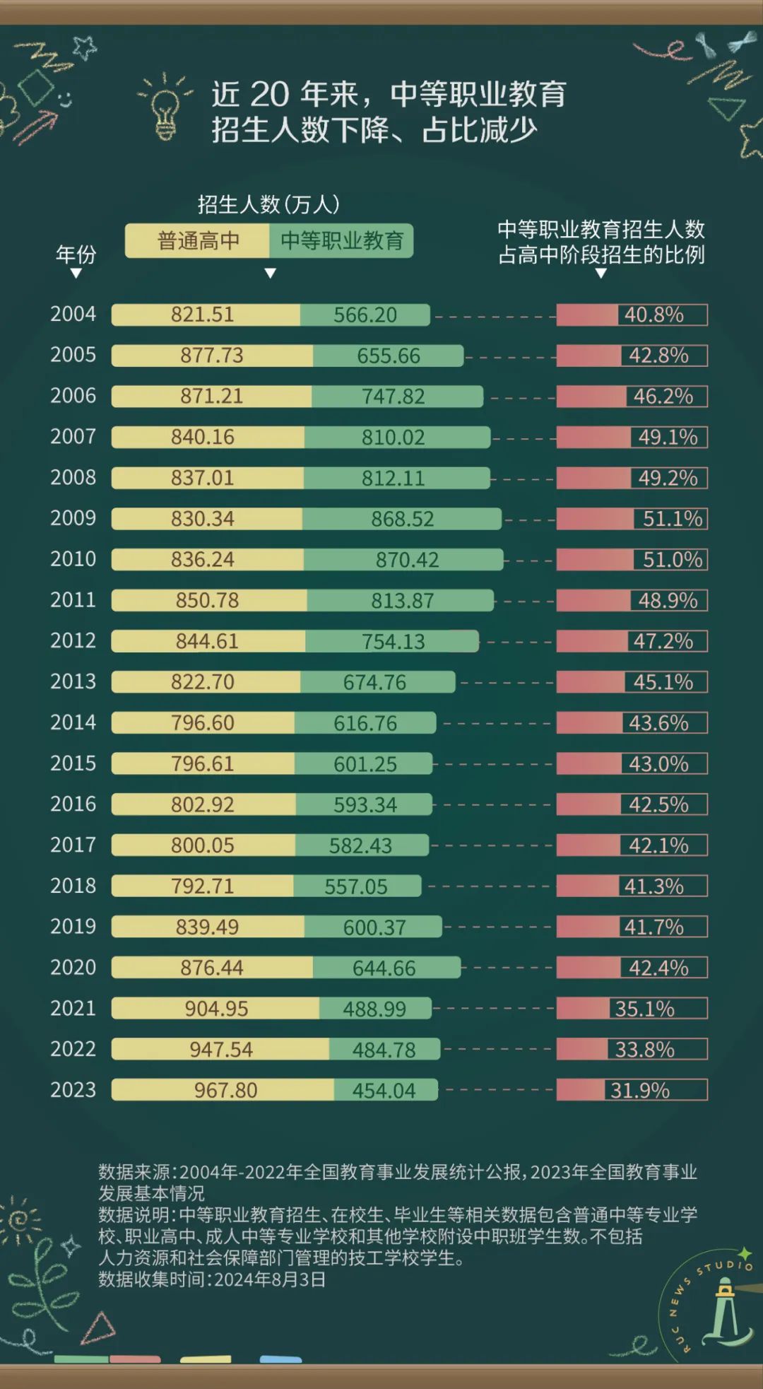 而从近20年的数据来看,中职学生的占比不断下滑,从巅峰时期2009年的51.1%,逐渐下降到2023年的31.9%。在这31.9%的中职学生中,还包含许多被动的选择:在“五五分流”指标下普高录取率的限制,以及来自学校层面的游说,都让一批学生被动地进入了中职。