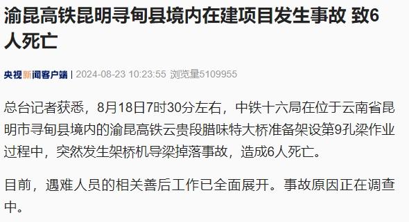 8月18日7时30分左右,位于云南省昆明市寻甸县境内的渝昆高铁云贵段腊味特大桥准备架设第9孔梁作业过程中,突然发生架桥机导梁掉落事故,造成6人死亡。