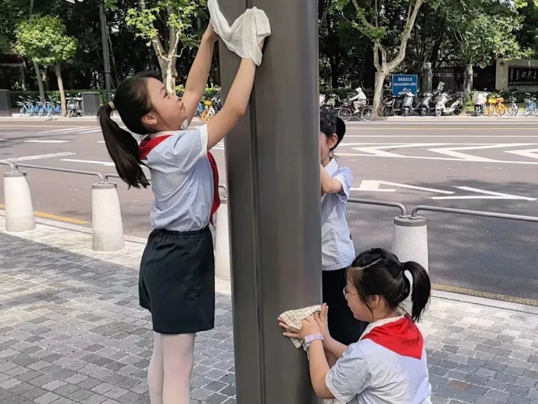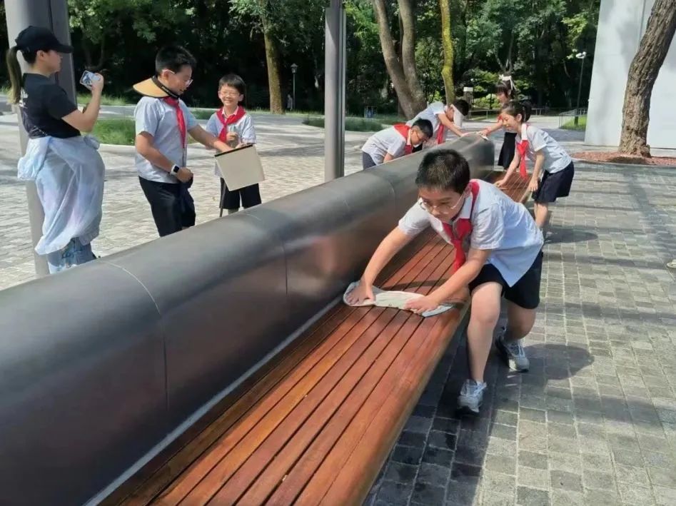 公交站台是一个城市的明信片,也是城市文明创建的重要窗口之一。为了让百年公交20路传递的城市形象更加动人,同学们兴奋地准备好自己的清洁工具开启“清扫大作战”。一个个小清洁工分工有序,配合默契,仔细擦拭着座椅、立柱上的尘垢,清扫地面上的垃圾。看着亮丽如新的公交站,稚嫩的脸庞露出了自豪的笑容。